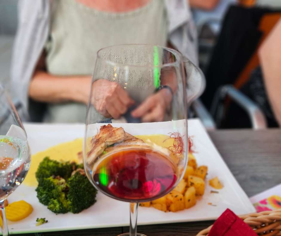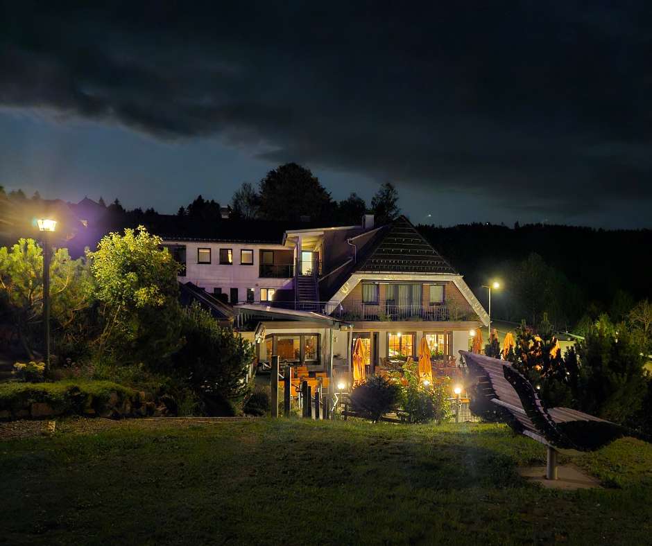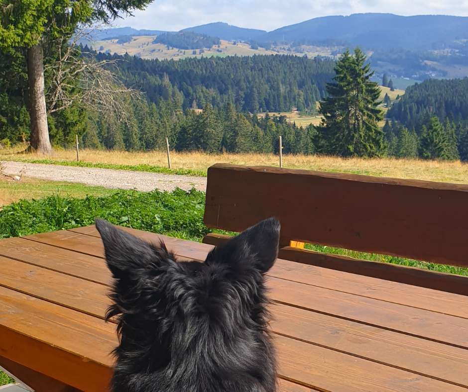 Abends genießen wir gemeinsam die feine Schwarzwaldküche auf der Panoramaterrasse und lassen den Tag entspannt ausklingen – selbstverständlich dürfen auch unsere Hunde beim Essen dabei sein.